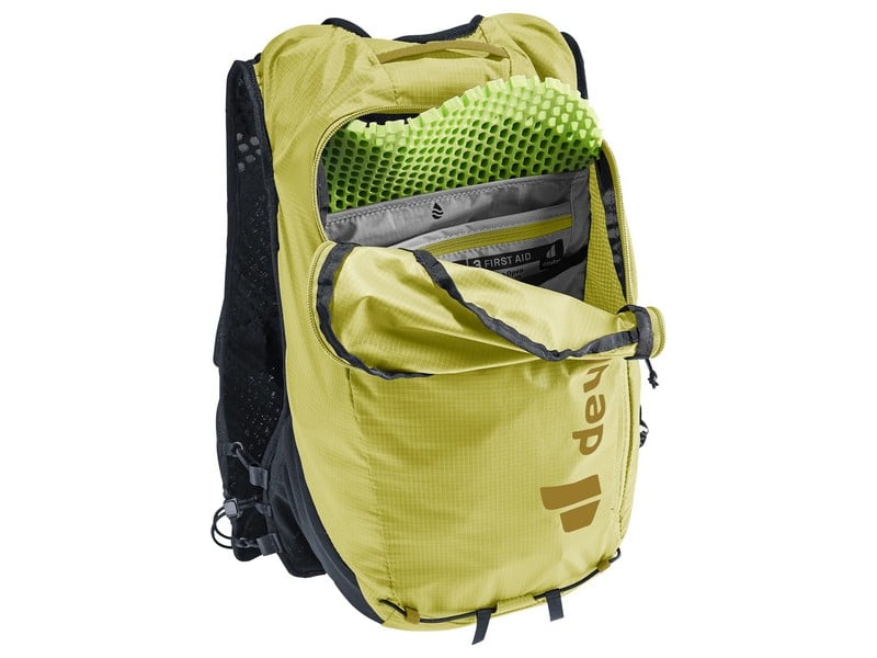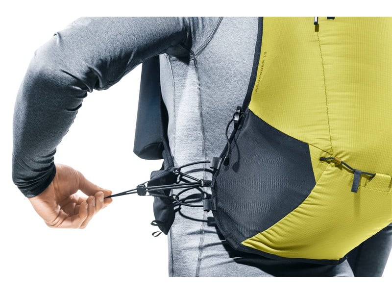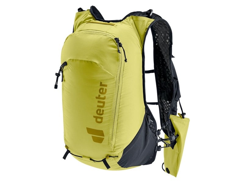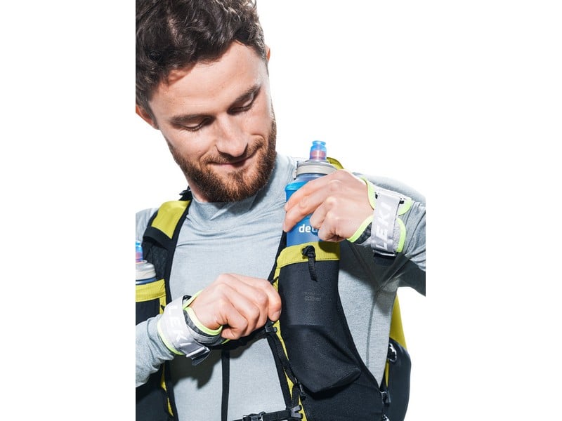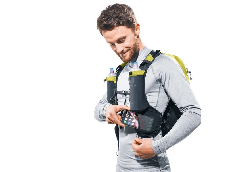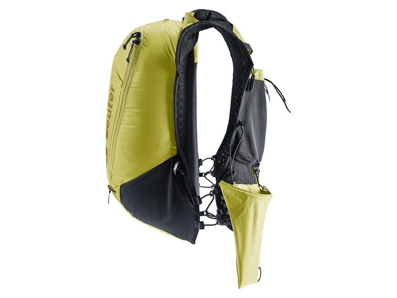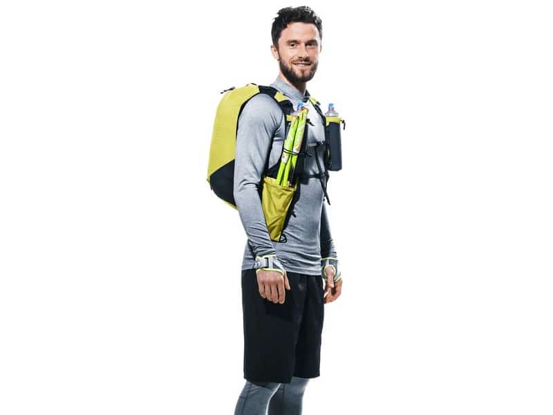 A stretch mesh inner pocket and side compression straps help eliminate load wobble no matter how challenging the terrain. A holster pocket on the front of one shoulder strap makes it quick and easy to access collapsible trekking poles. And there is space for soft flasks and a GPS in the shoulder strap pockets. The body fabric is made from 100% recycled materials and is bluesign® certified.