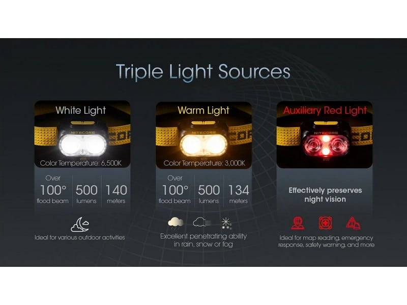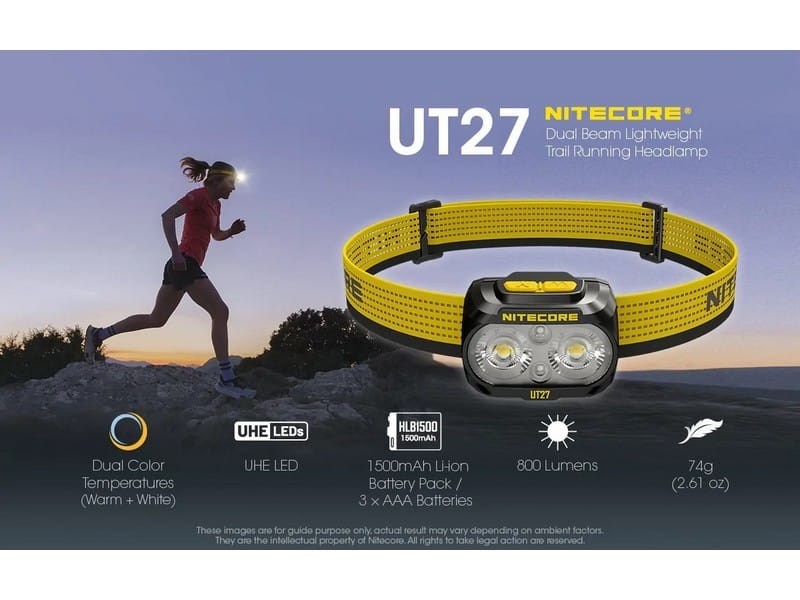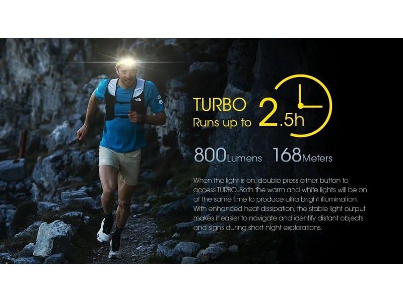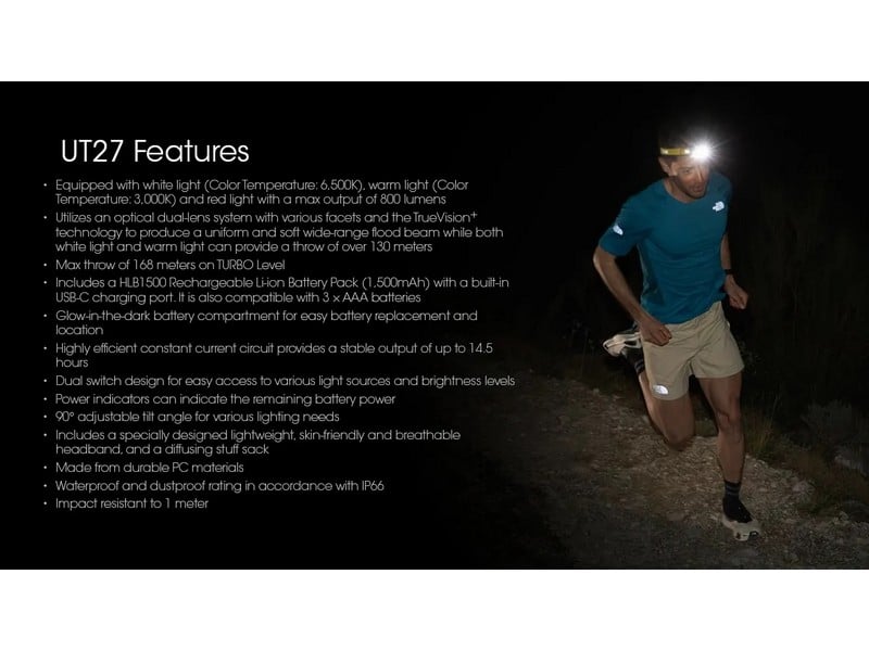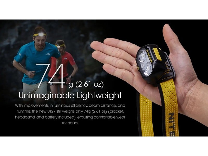 The Nitecore UT27 stands out as a bright lightweight headlamp designed for running, with insights from professional trail runners across the globe. It features both white and warm light options. The white light spans an impressive 132m and yields an output of 500 lumens, ideal for outdoor pursuits like trail running, hiking, and nocturnal strolls. Conversely, the warm light extends up to 124m with the same 500-lumen output making it excellent for penetrating challenging weather conditions like rain, snow, or fog. By combining both lights on Turbo mode, an astounding 800 lumens of brightness emerges, casting a seamlessly uniform beam that reaches 160m. The UT27 further offers a red light mode, switchable between a steady glow and a flashing signal, facilitating awareness of your surroundings. Effortless toggling between light options and brightness adjustments is enabled through the user-friendly dual switches.