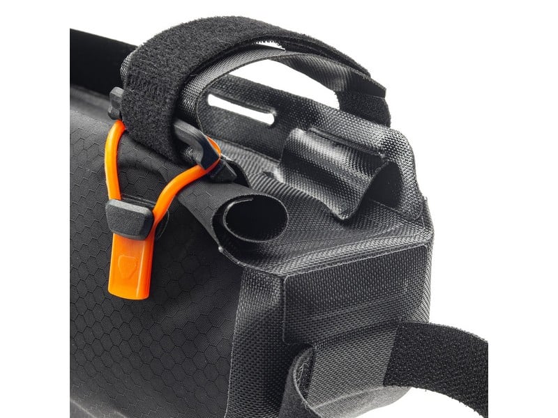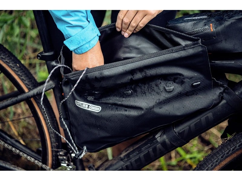 ORTLIEB’s frame bag with roll closure helps you start off your bike packing adventure well-prepared. Thanks to the waterproof roll closure —which is closed by three silicone rings— paired with the proven nylon fabric, your luggage inside the bag stays absolutely dry even in the most adverse conditions. The Frame-Pack RC is ideal for storing heavy luggage, such as tools or food, centrally on the bike. This maintains a low center of gravity so that the trail fun remains high even when fully loaded. The roll closure and its large opening allow easy access and easy packing of the bag. The assembly within the frame triangle is done with strong and robust Velcro fasteners. The specific positioning of the Velcro straps along the circumference of the bag enables individual adjustment to the dimensions of your bike.