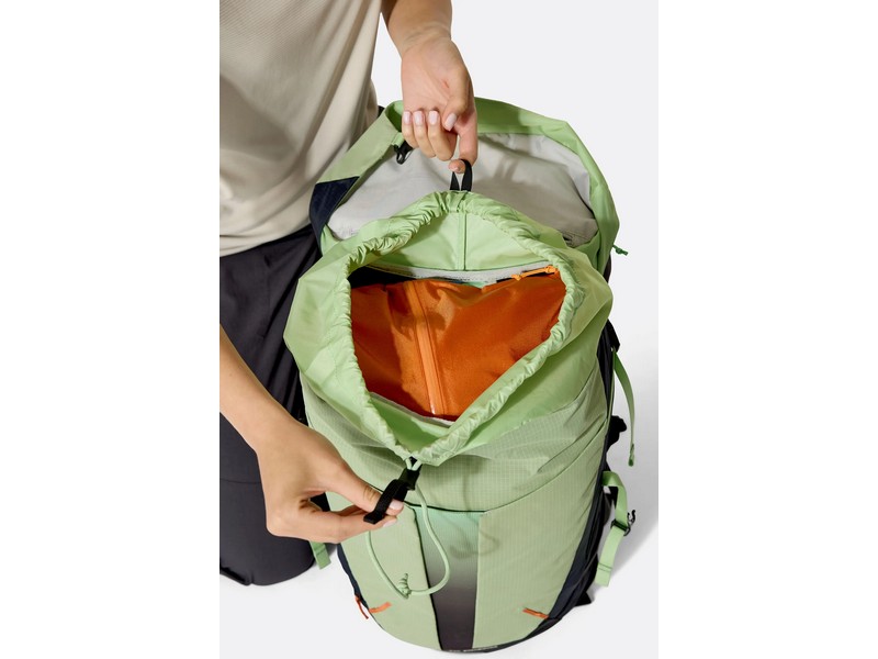 - Lid with internal and external pockets and drawstring entry to the main compartment.