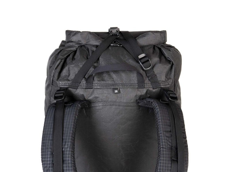 Over-the-top Y-Strap Compression utilizes 5/8” webbing with adjustable buckle and is used to close and compress the roll top opening of the pack.