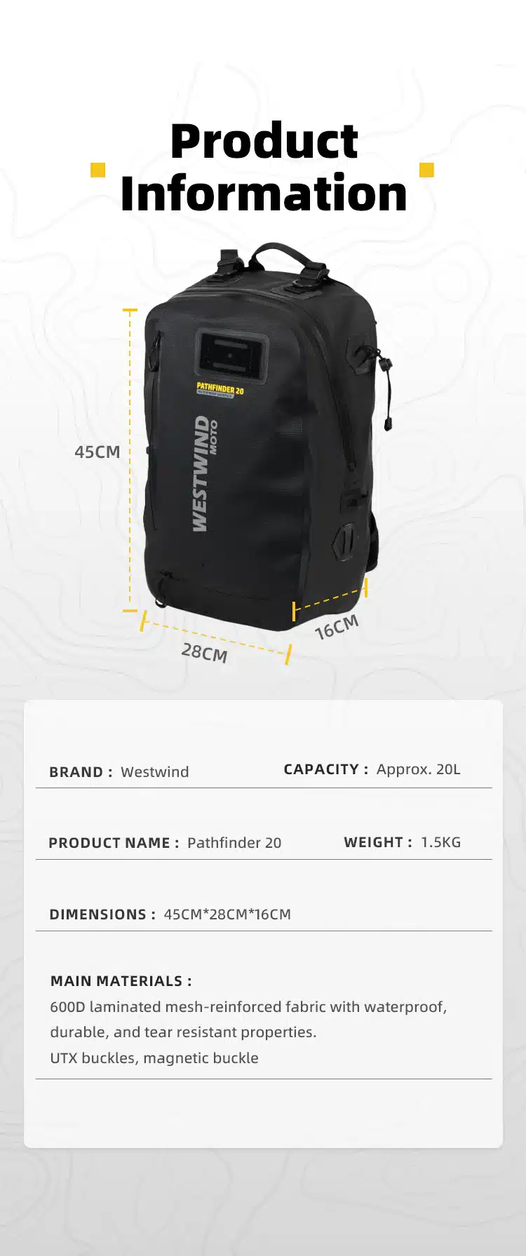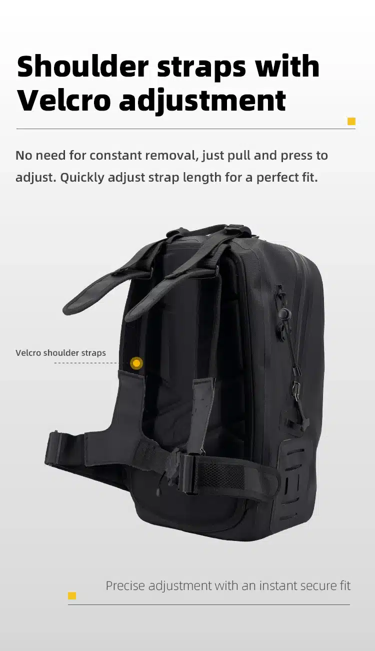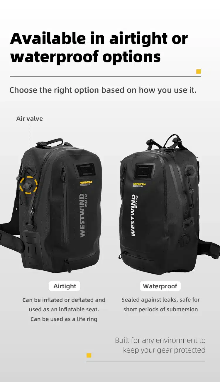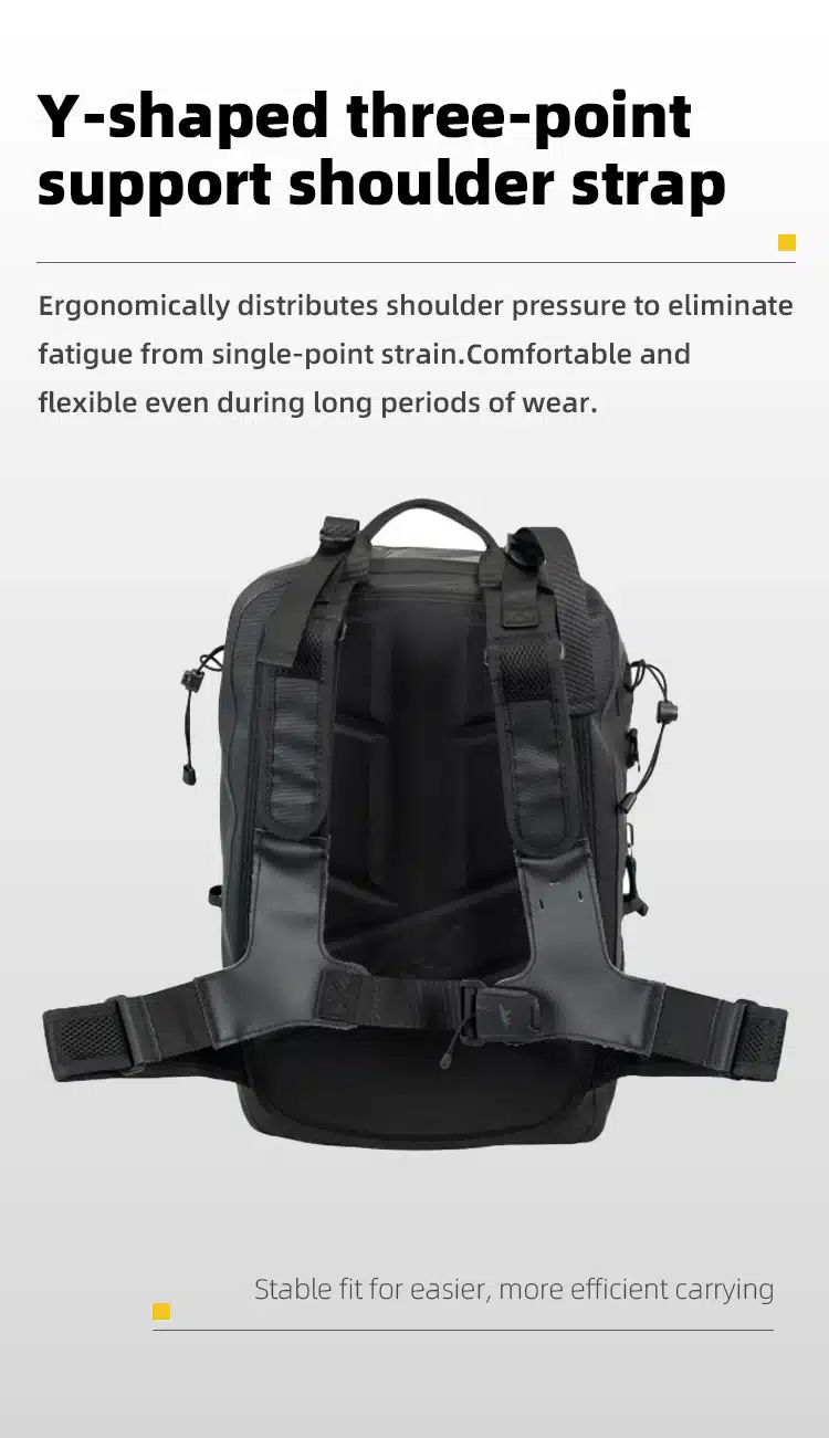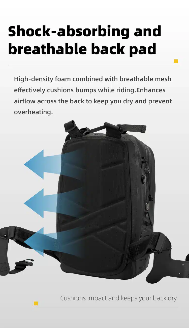 The Pathfinder 20 Backpack is a multifunctional waterproof bag designed for daily riding and casual travel. With a capacity of approximately 20 liters, it can easily store a 13-inch laptop. The backpack features unique cross straps with magnetic quick-release buckles, making it easy to adjust and comfortable to carry. It also includes a built-in mesh helmet bag, capable of accommodating a full-face helmet when needed. The shoulder straps are equipped with a magnetic base for attaching a waterproof phone pouch, providing extra convenience.